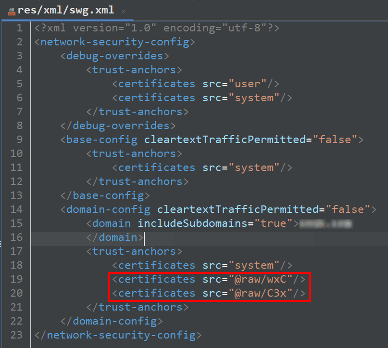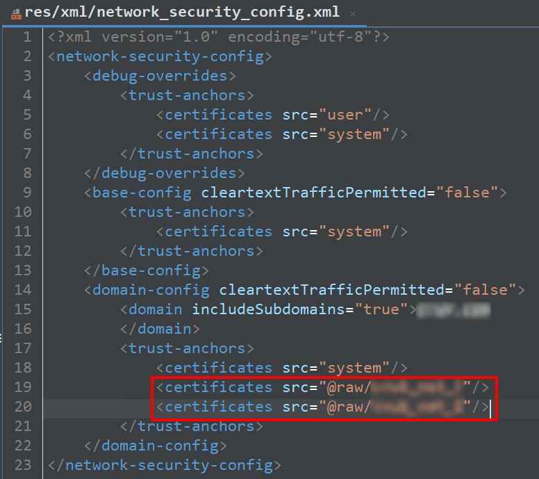 На рис. 8–9 представлен пример использования встроенных сертификатов @raw/<имя> в файле network_security_config.xml и фрагмент одного из сертификатов.