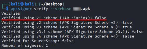 Также малопригодным для анализа оказался раздел Certificate: сканер выдавал слишком много ложноположительных срабатываний. К примеру, MobSF обнаружил использование подписи по схеме v1 и зафиксировал уязвимость Janus. Ручная проверка показала, что этого недостатка в приложении нет (см. рис. 16).