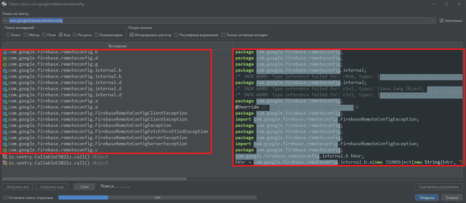 После шилдинга анализатор перестал фиксировать использование классов com.google.firebase.remoteconfig.*. PT MAZE обфусцировал прямые ссылки на соответствующие классы Firebase, поэтому декомпилятор перестал отображать вызовы Remote Config в явном виде.