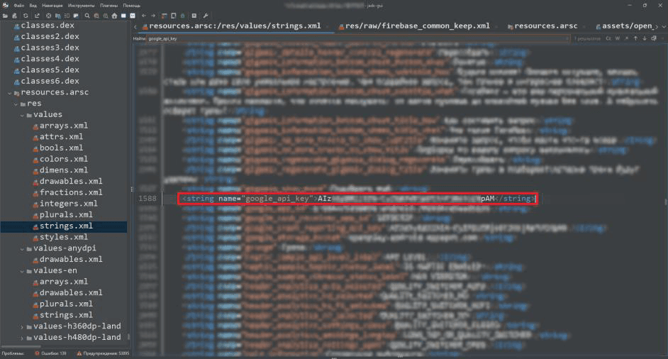 В приложениях могут открыто храниться всевозможные секреты: учетные данные, API-ключи, токены интеграций, строки и криптографические ключи (в strings.xml, ресурсах res/raw/, бинарных файлах или прямо в исходном коде). Эту информацию можно без труда извлечь из APK-файла и использовать для несанкционированного доступа к сервисам. Например, строковое значение в коде может заинтересовать злоумышленника из-за схожести с токеном.