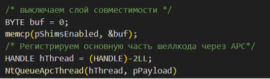 Но как выполняется записанный злоумышленником код? Переменная g_ShimsEnabled отвечает за активацию режима ShimEngine (это код, ответственный за слой совместимости для запуска старых приложений на новых версиях Windows). В ходе выполнения техники вредонос может включить этот слой и указать в качестве адреса его процедуры свой вредоносный код. Управление из этой процедуры должно быть возвращено обратно в функцию инициализации программы, поэтому шелл-код состоит из двух компонентов: заглушки и основного кода. Заглушка нужна лишь для того, чтобы корректно продолжить выполнение программы и добавить основной пейлоад в очередь на исполнение через APC. Ее код может выглядеть следующим образом (см. рис. 2).